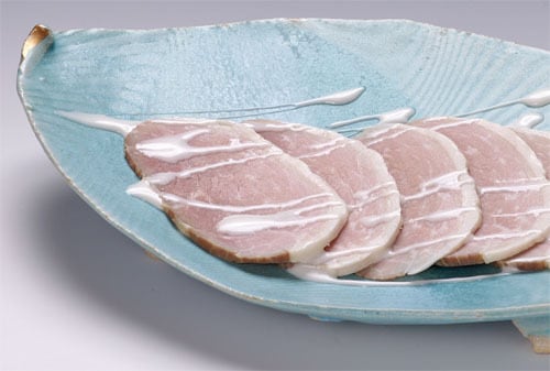 美味しいばあく豚を畑のお野菜で漬け込み、裏山の山桜で燻煙したボンレスハムです。